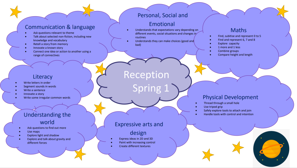 Here you will find our overview of the learning that will take place in Reception; our yearly overiew and current half termly topic learning.